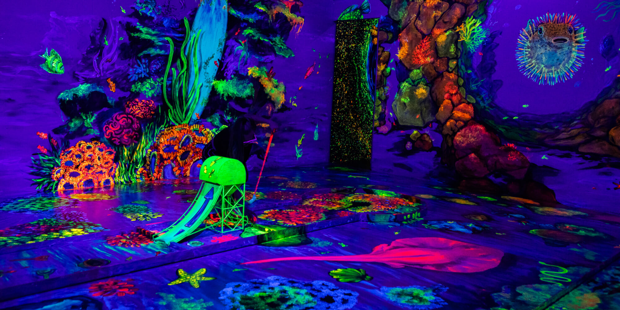 We love our walls and floors… It took our artists over 1300 hours to create the artworks in the Glowing Rooms, so please don’t lean on the walls and don’t bang clubs on anything! Also, our obstacles are fragile so please don’t step or stand on them.